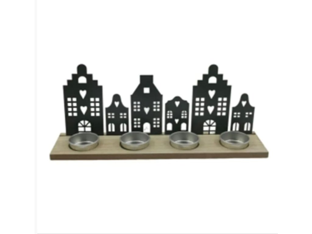 Krásný adventní svícen se čtyřmi skleněnými kalíšky na čajové svíčky, doplněný kovovými siluetami domečků a stromečků. Kombinace černého kovu a přírodního dřeva působí moderně a...