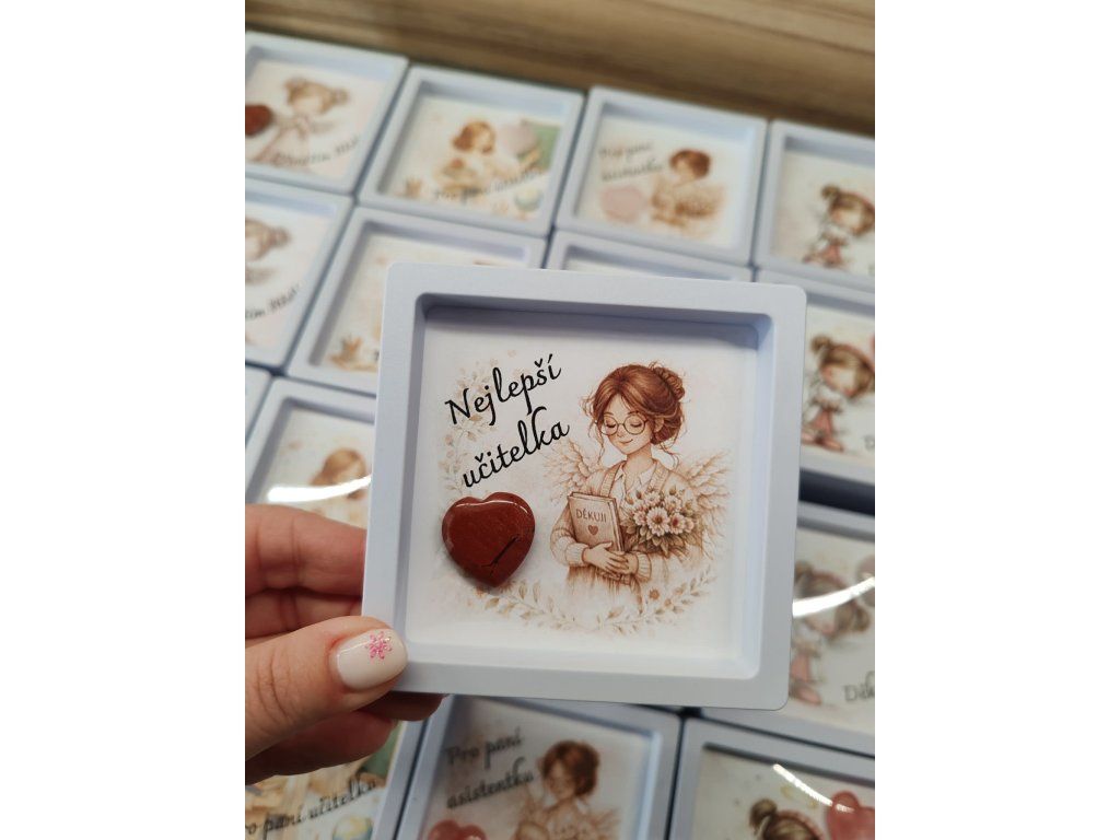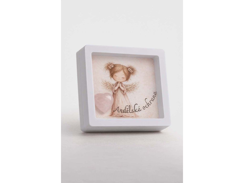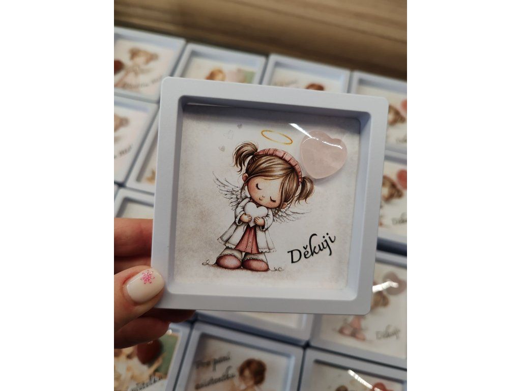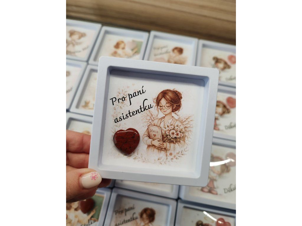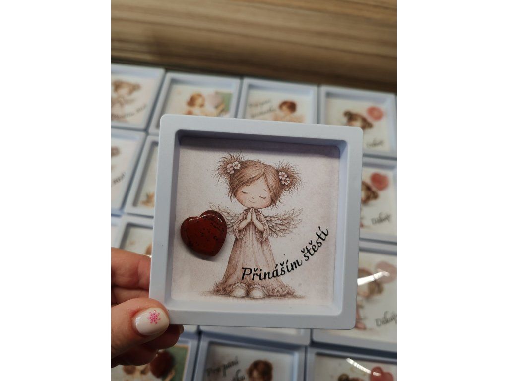 Každý rámeček obsahuje jemnou ilustraci s něžným motivem a skutečné minerální srdíčko, které dodává dárku osobitost a energii.