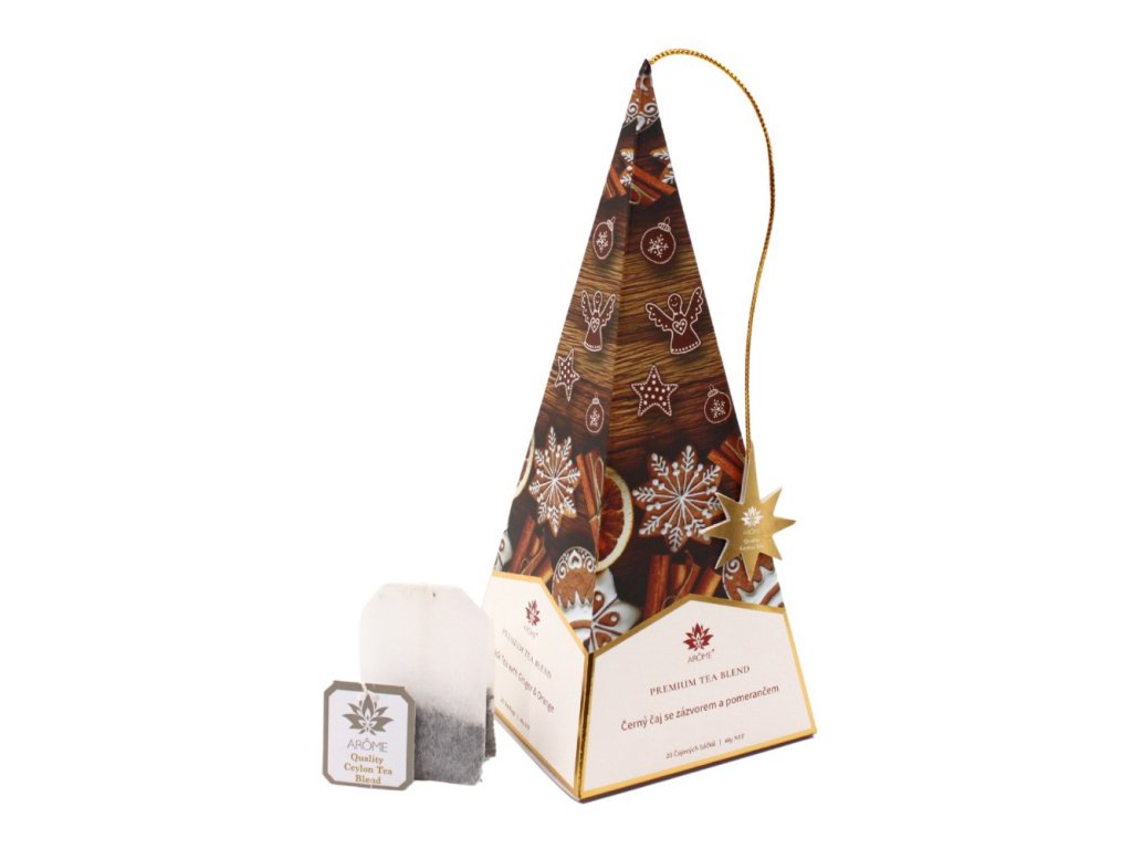 20 čajových sáčků s výborným černým čajem ochuceným pomerančem a zázvorem je zabaleno v krásné designové pyramidě s vánočním motivem ozdobených perníčků.