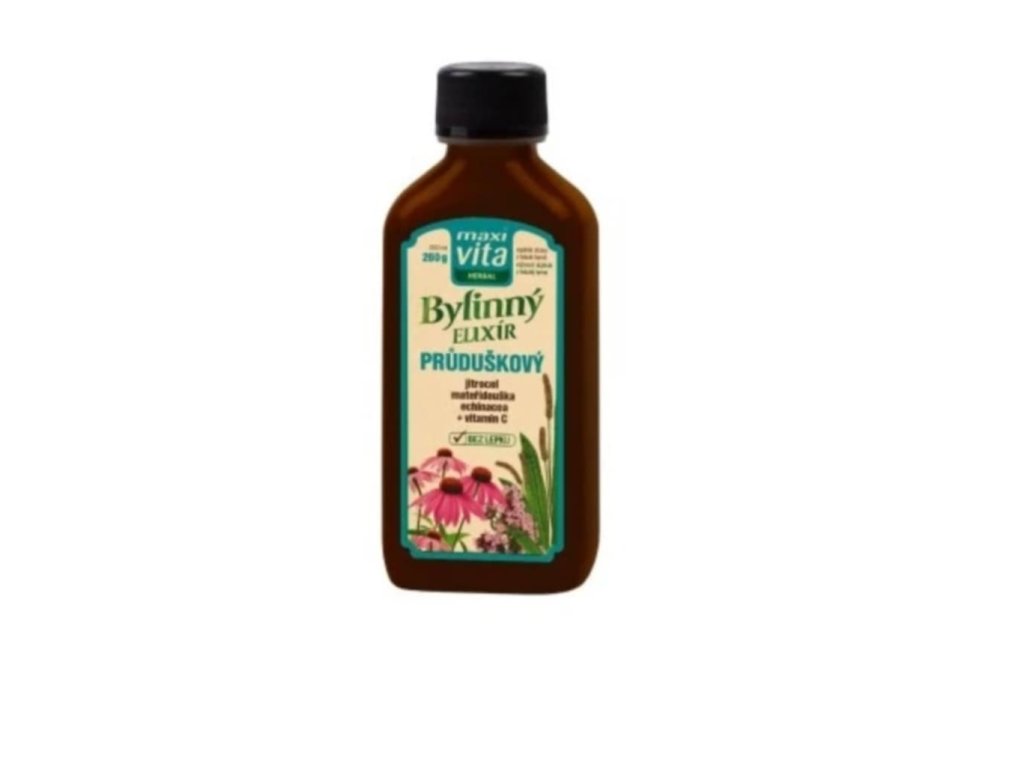Maxivita Herbal Bylinný elixír Průduškový je doplněk stravy v tekuté formě s echinaceou, jitrocelem a mateřídouškou, které působí blahodárně na zdraví dýchacího systému. Echinacea (třapatka nachová) podporuje přirozenou obranyschopnost organizmu. Přípravek je doplněný vitaminem C, který přispívá k normální funkci imunitního systému.