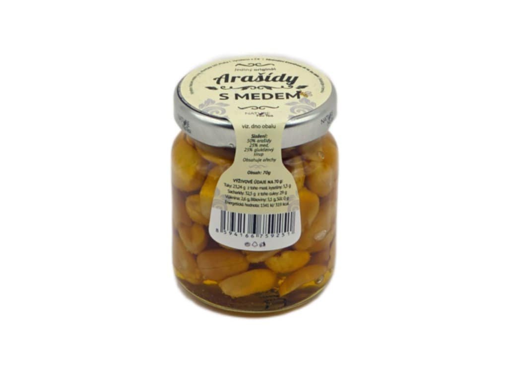 Složení: 50 % arašídy, 25 % glukózový sirup, 25 % med