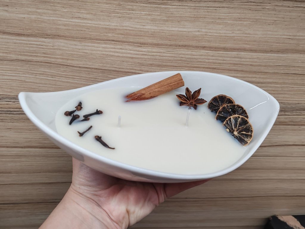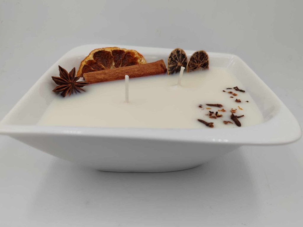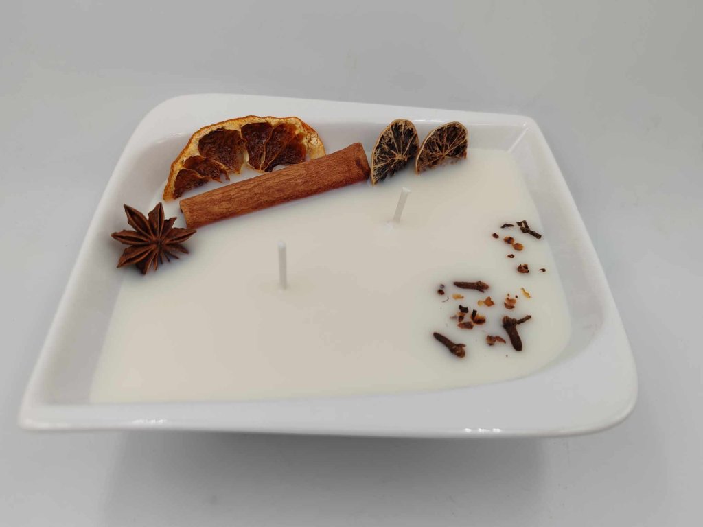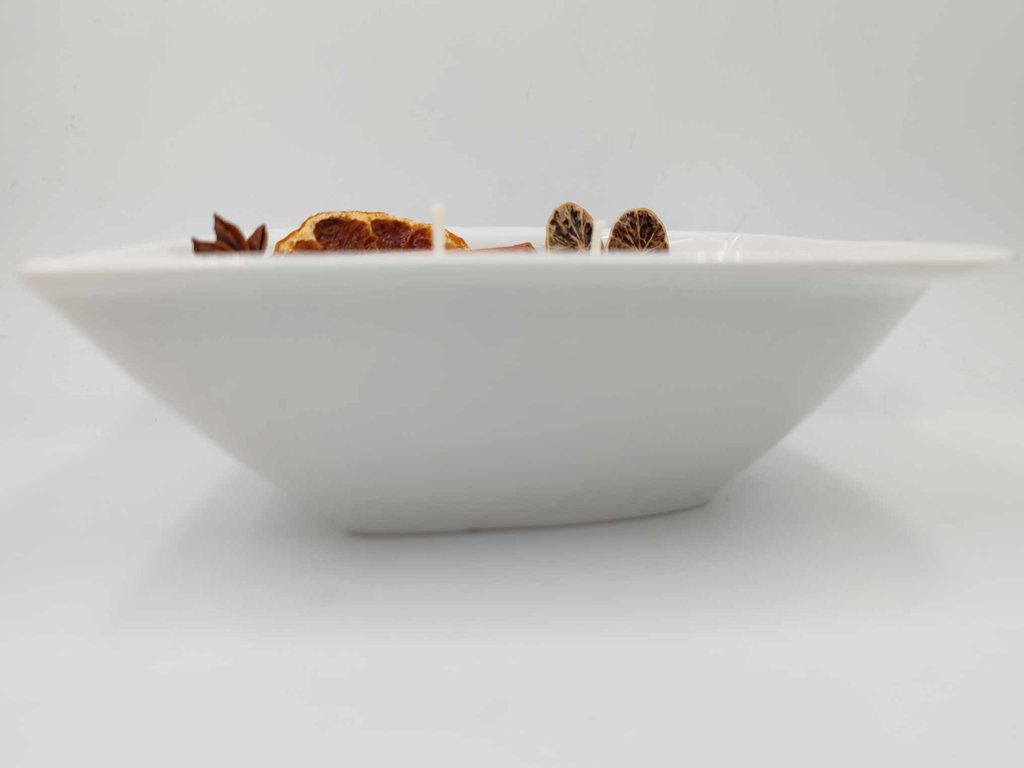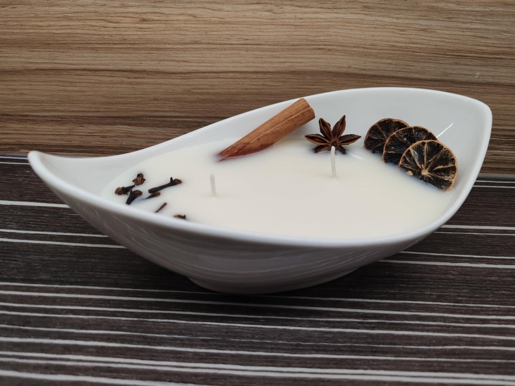 Složení/materiál: Sójový vosk, esenciální oleje, dekorace, miska