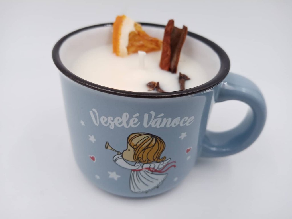 Složení/materiál: Sójový vosk, esenciální oleje, dekorace, hrneček