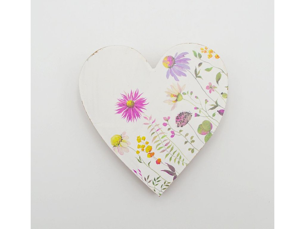 Srdce dřevo potisk luční kvítí 13cm bílé