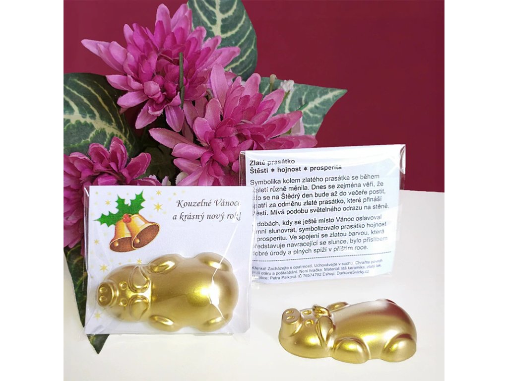Prasátka balím do celofánového sáčku s dárkovou kartou s nápisem "Pro štěstí". V eshopu najdete ještě prasátka s nápisem "Kouzelné Vánoce a krásný nový rok." Jelikož prasátka vyrábím už během léta a pak je rovnou balím, nejsou změny textu možné a k dispozici mám jen zmíněné varianty.
