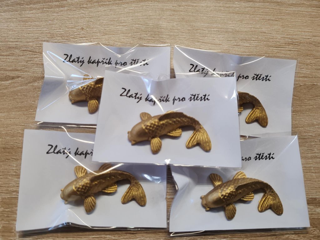 Balení: průhledný sáček s kartičkou „Zlatý kapřík pro štěstí“